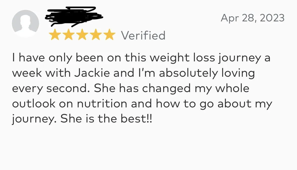 "I have only been on this weight loss journey a week with Jackie and I’m absolutely loving every second. She has changed my whole outlook on nutrition and how to go about my journey. She is the best!!"